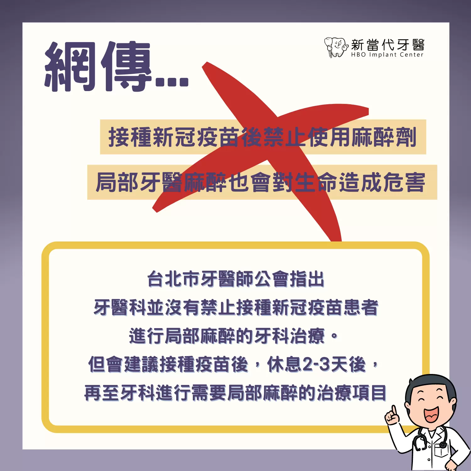 接種新冠疫苗者,牙科或醫療麻醉相關須知鄉親愛注意!最近網路上有傳言......「接種新冠疫苗者不能使用麻醉劑,甚至局部牙科麻醉也會造成生命危險?!須至少等4週之後才可以使用麻醉劑?」真的是這樣嗎?其實並不然快來聽聽醫師們怎麼說!目前牙醫科並沒有禁止接種新冠疫苗的患者進行局部麻醉治療!但因為在打完疫苗後可能有2-3天會產生副作用如:肌肉痠痛、發燒或是疲倦等症狀!這些副作用 可能會導致醫師將其與麻醉的副作用混淆會建議民眾先展緩 非緊急的牙科麻醉治療項目等到 2到3天後副作用緩解 再來牙科就醫喔!但若遇緊急情況,為了挽救生命以利手術進行並沒有禁止使用麻醉藥物的情況唷! 分享到 聯絡我們Contact 姓名 * 諮詢方式 * 電話諮詢 預約現場諮詢 視訊諮詢 出生日期 * 聯絡時間 * 09:00 至 12:00 12:30 至 18:00 18:00 至 21:30 時間皆可 行動電話 * LINE ID Wechat ID 聯絡信箱 * 諮詢項目 * 牙齦腫痛 牙周病專科 一日全口重建 高壓氧植牙 無痛舒眠治療 牙齒矯正 兒童牙科 牙齒美白 一般牙科 詳細說明 * 驗證碼 * 送出